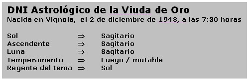 El día que se cometió el atentado contra su ex marido, Urano transitaba el grado 29 de Capricornio, y culminaba un aspecto de tensión y de amenaza a la posición que el mismo Urano tiene en su tema natal, ubicado en el grado 29 de Cáncer. Fue una acción descabellada, realizada en el momento menos propicio. Si la “viuda de oro” hubiese tenido conocimientos astrológicos, nunca hubiera permitido que el atentado a su marido se hubiera llevado a cabo ese día; de todas formas, seguro que ahora dispondrá de tiempo para poder estudiar cualquier cosa, incluso astrología.