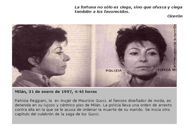 Los Gucci siempre fueron una familia marcada por las luchas de poder. El abuelo de Maurizio fue el pionero de la saga y ya en los años 50 había consolidado una empresa reconocida internacionalmente. Tras su muerte, sus nietos originaron el primer gran conflicto de intereses. Maurizio, falsificando la firma de su padre, se apropió de la mitad del capital que a aquel le correspondía, pero tras la denuncia de sus familiares, sus bienes fueron hipotecados por el Estado, aunque posteriormente fue absuelto, recuperando así la presidencia del grupo. En 1993 vendió el 50% del capital a un grupo árabe y se quedó otro tanto. Maurizio tenía un gran imperio, poder y prestigio y era el centro de una lucha encarnizada de intereses, una lucha que se recrudeció a partir del divorcio de su primera esposa, una viuda a la que se vio llorar desconsoladamente en el majestuoso funeral de su ex marido. Lágrimas que, como algunos sospecharon, resultaron ser más de cocodrilo que de verdadera aflicción.